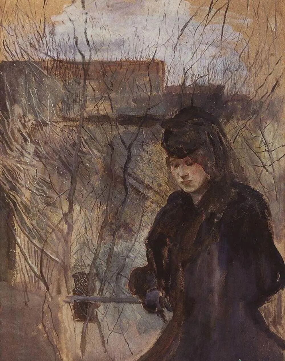 《春意盎然的女人》,画面灰色的背景,应该表明再冬天,万物凋零,枯枝败叶,女人也穿着厚实的冬衣!那为什么会说是春意盎然的女人呢,也许画家是想说明“冬天来了,春天还会远吗”,寓意着她正在走出阴霾,走向春天吧!