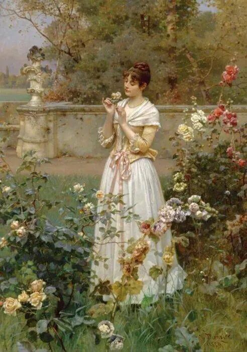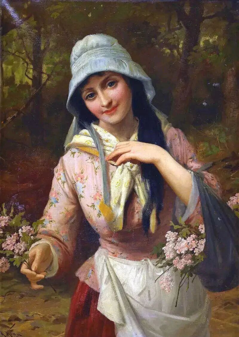 相比于那些室内贵妇人空虚无聊享受生活的画作,这幅大自然中农家女孩一路摘花的场景,显得格外的清新自然脱俗,有一种纯净清纯的美,其微微一笑,更使人心情舒畅!
