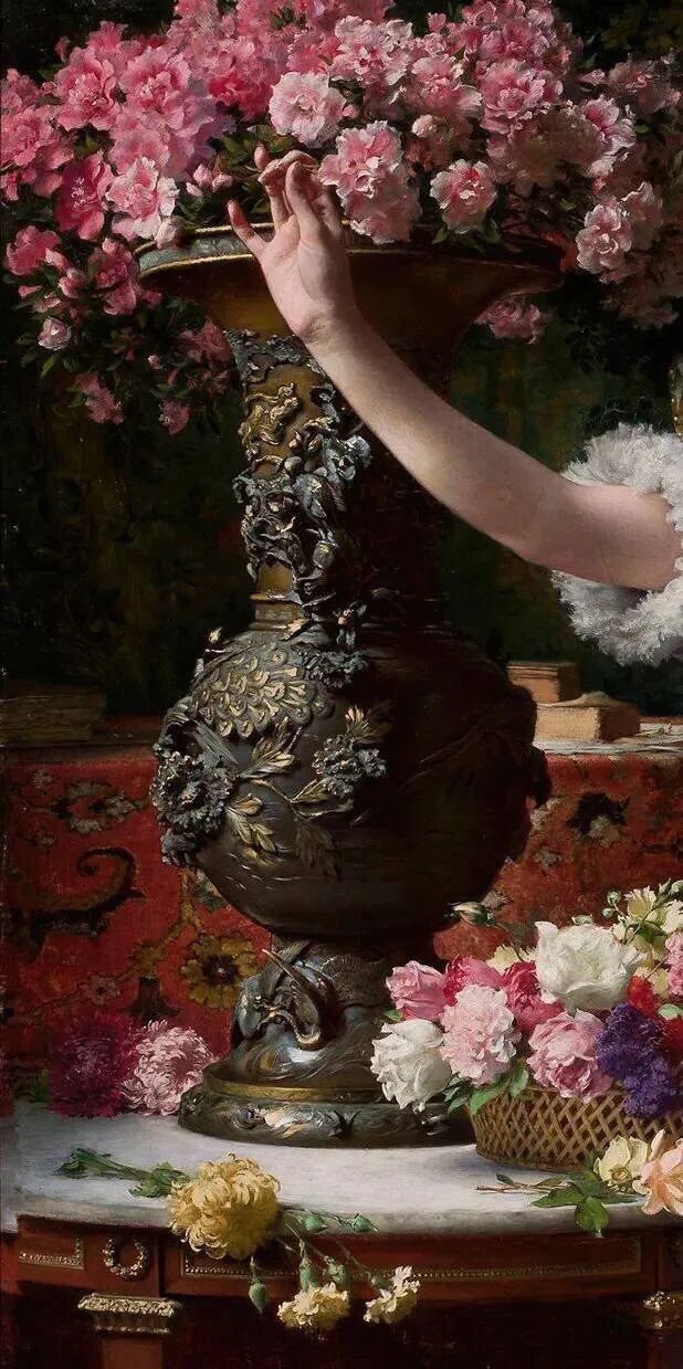 画家对室内的各个细节刻画可谓是不遗余力,还有女主人的衣裙、芊芊玉手也作了精致的描绘,那束生机勃勃正在盛开的花朵,点缀着女主人此时此刻的心情!看起来这户人家家庭幸福、和睦而温馨,男主人也非常宠爱妻子!