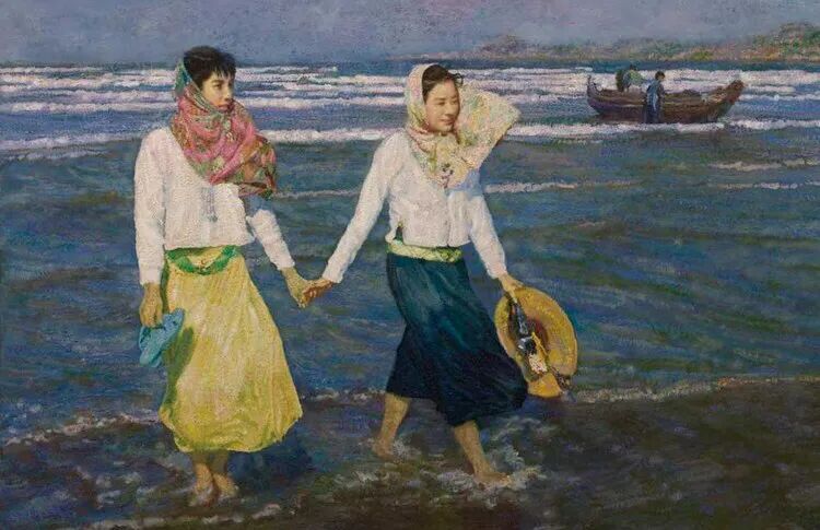 《姐妹花》,背景是远处出海捕鱼的小船,前景是姐妹俩肩并着肩,手挽着手,在海水中踏浪而行,一起走向美好的未来!这是一幅寓意美好的画面,感觉新生活就在不远处向我们招手!