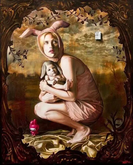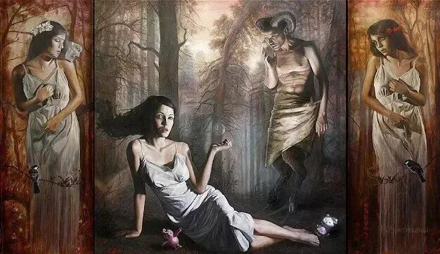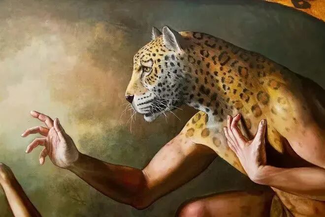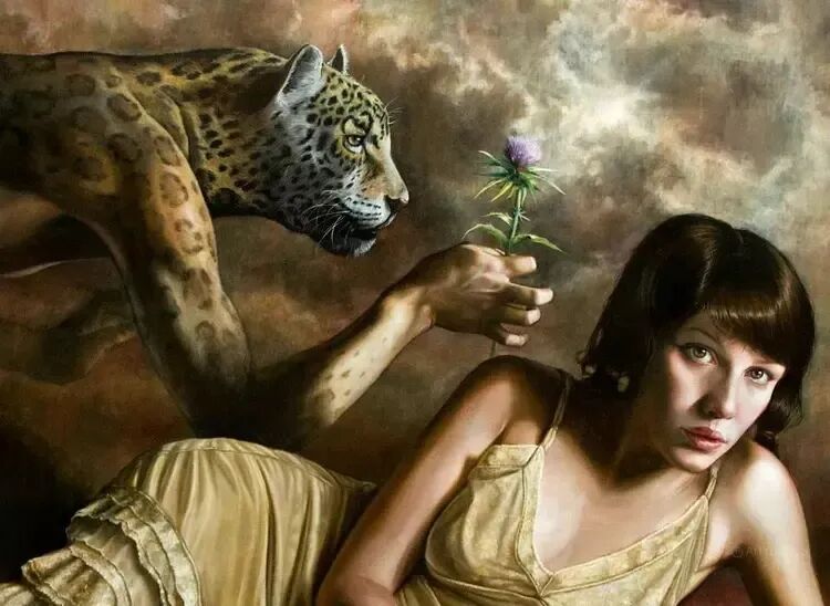 这位画家的作品,是不是很魔幻,但又很现实!一幅表达男女关系的作品,男人却被画成了老虎头,而爪子却是人类的手!老虎🐯自然是吃人吃肉,但他手里拿了一朵花献给女人,表达自己对她的爱慕之心!