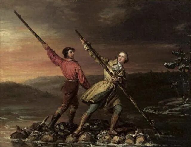 丹尼尔的画作也带有一定的浪漫主义,如上面这幅画!两位小青年撑着木筏,迎着风浪,在暮色苍茫中奋力前行,从这幅画中我们看到了一种积极向上的正能量,同心协力的团体精神!犹如我们每天面对的任何困难与挫折,你只能勇敢地闯过去,方能到达彼岸!