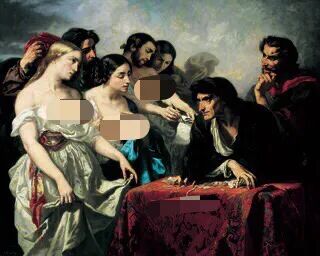 感觉这幅画就是分赃的场景,画家刻画得非常夸张,两位女士最靠前,估计想分的多一点,因为她们的裙兜非常大,可以藏很多金银珠宝!男人的兴趣,比较广泛,除了💰,也许还有女人吧!
