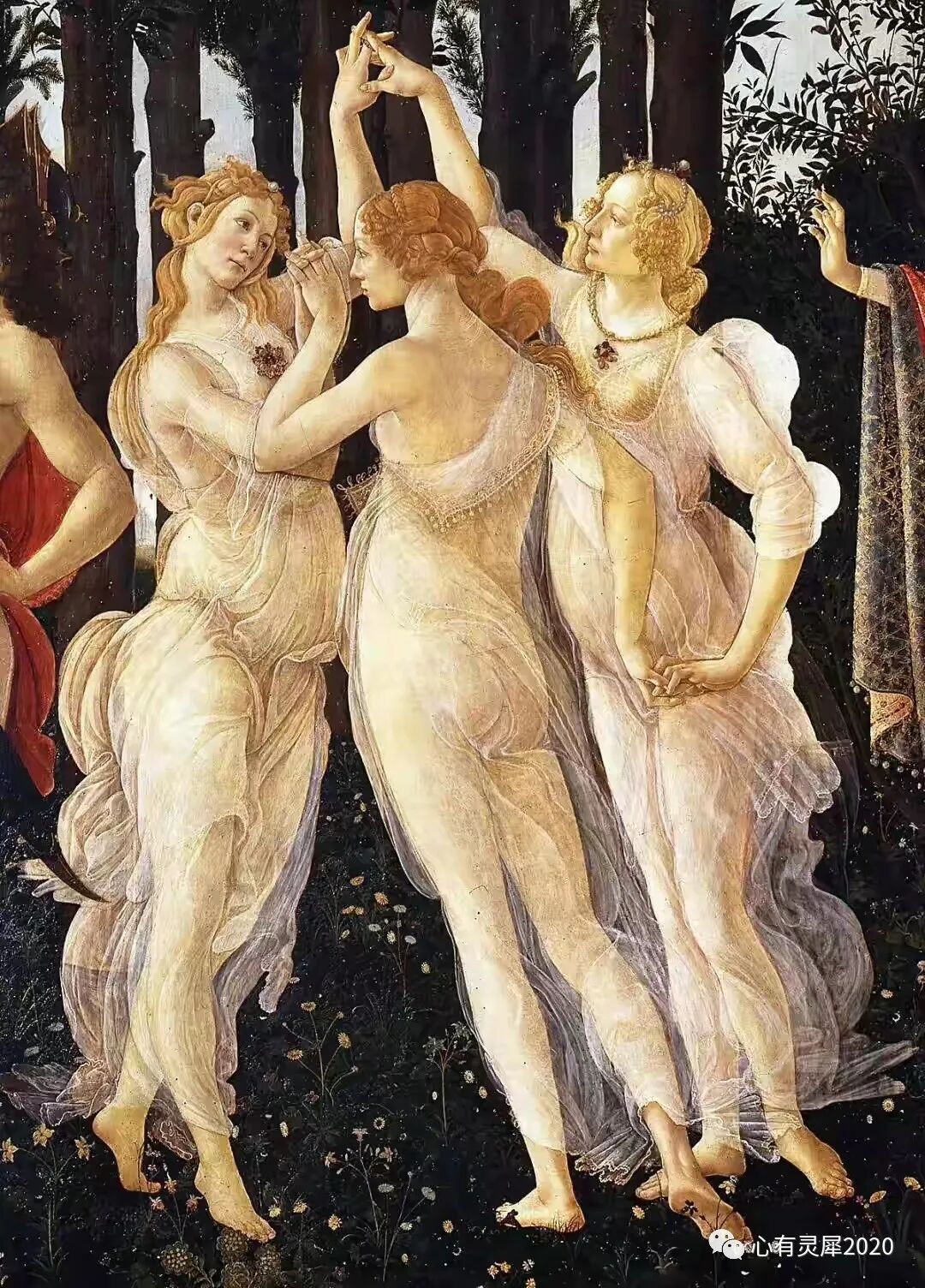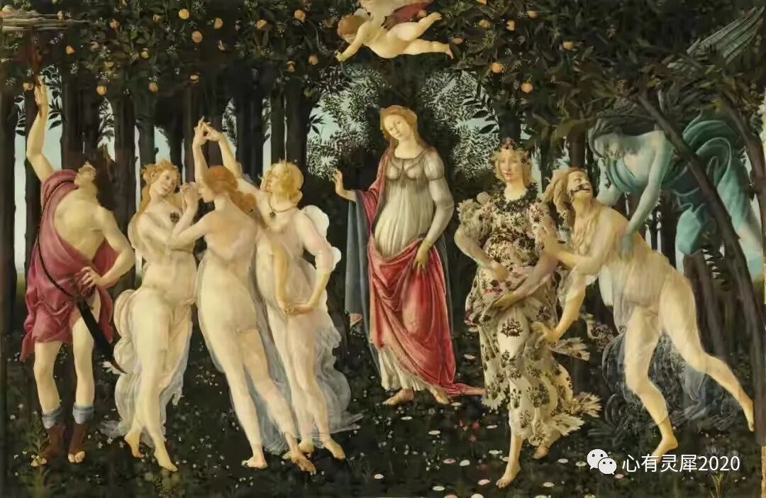 大家都知道的大师波提切利1482年创作的《春》,三位仙女在森林里翩翩起舞,浑身薄纱环绕,洋溢着春天的气息!