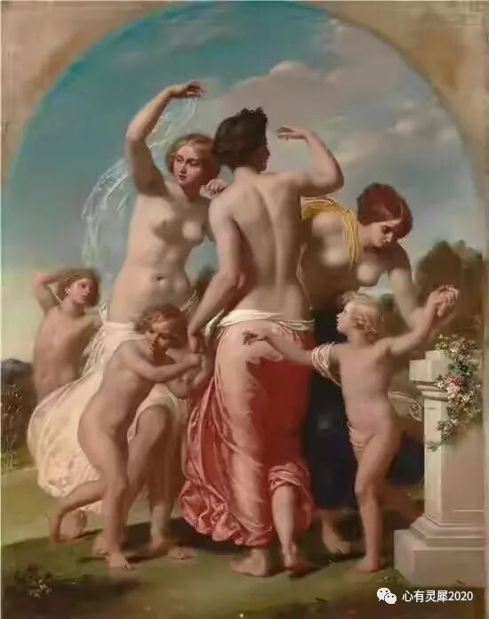 威廉.爱德华.弗罗斯特,1856年创作的美惠三女神》,画面上三个小天使陪伴在母亲身边,三位母亲的光辉形象跃然画布上!