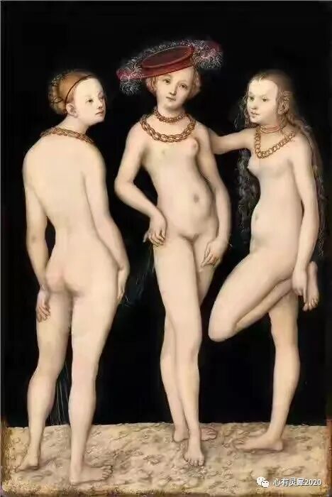 德国艺术家老卢卡斯·克拉纳赫笔下的美惠三女神,三位女子身材修长,三种姿势,回头望着观赏者,黑色的背景渲染了一种诡异的气氛!
