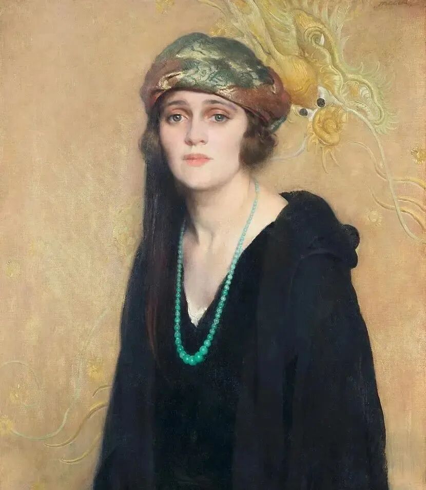 这贵妇人头部有一条张牙舞爪的龙头,画家是在象征她的身份吗,也许是皇家的公主或者皇后娘娘吧!
