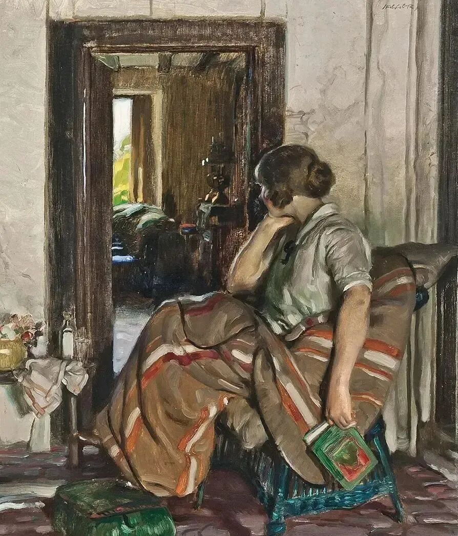 整幅画面的色彩显得有些做旧复古。而主要突出了少妇手中拿着的那本暗绿色的书籍!她坐在那把椅子上,托着腮望着窗外的风景,她在想什么呢!