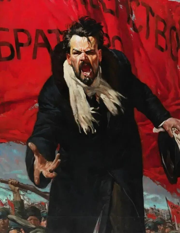 如果说前两幅都刻画了人物的内心世界,那这幅就来了一个大转弯,后景是鲜艳的红色旗帜🚩在迎风飘扬,小编不懂具体写了什么,但肯定是什么革命标语!因为在旗帜旁边都是拿着枪的士兵,他们挥舞着手臂,在摇旗呐喊!
