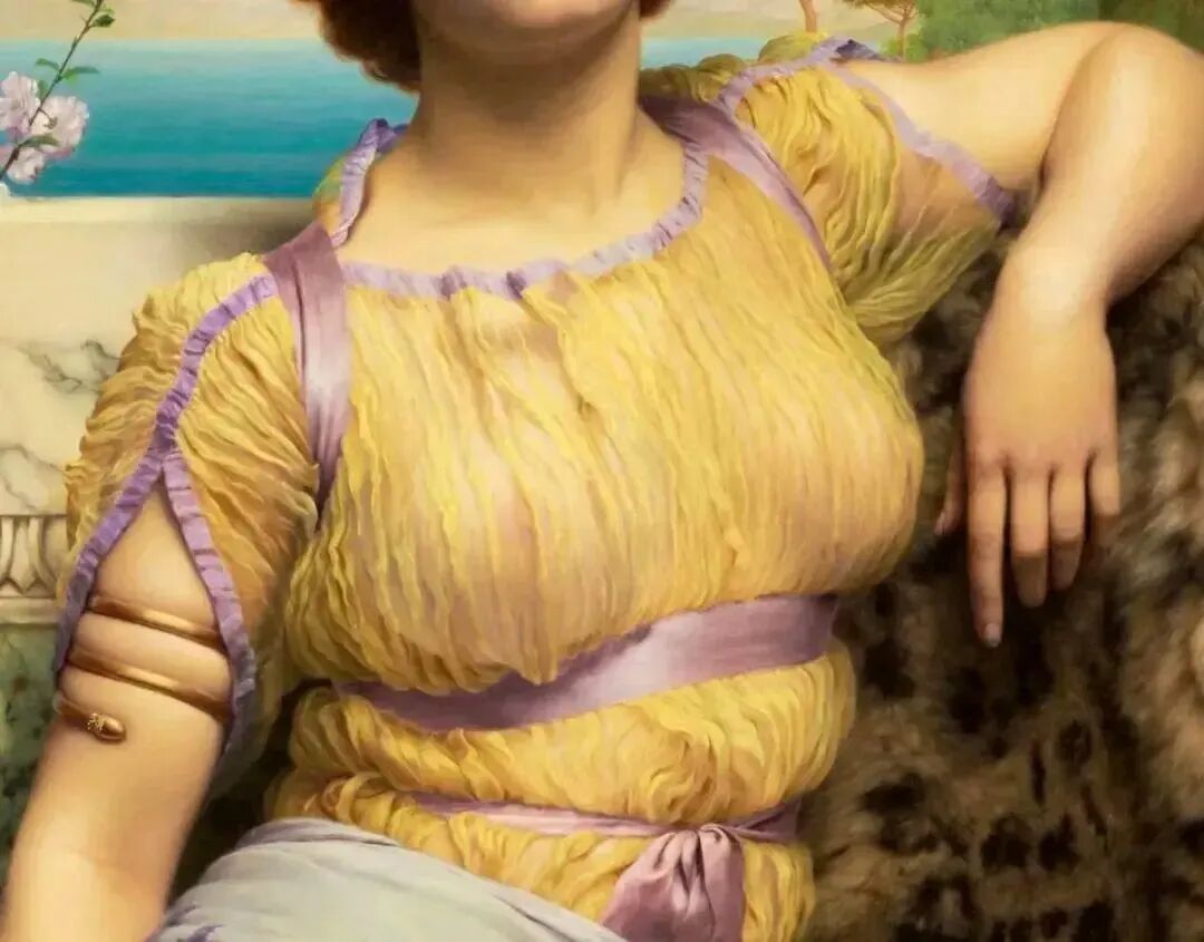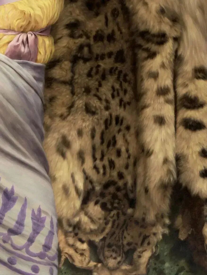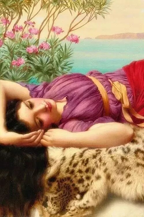 《爱奥尼亚舞女》,是高多德最杰出的作品之一,也是进入拍卖场的最优秀作品之一。因为这幅画包含了很多东西,除了女性凹凸有致的曲线美,还有就是鸟语花香、有山有水、有树木有蓝天,大理石、那件老虎皮,应有尽有!