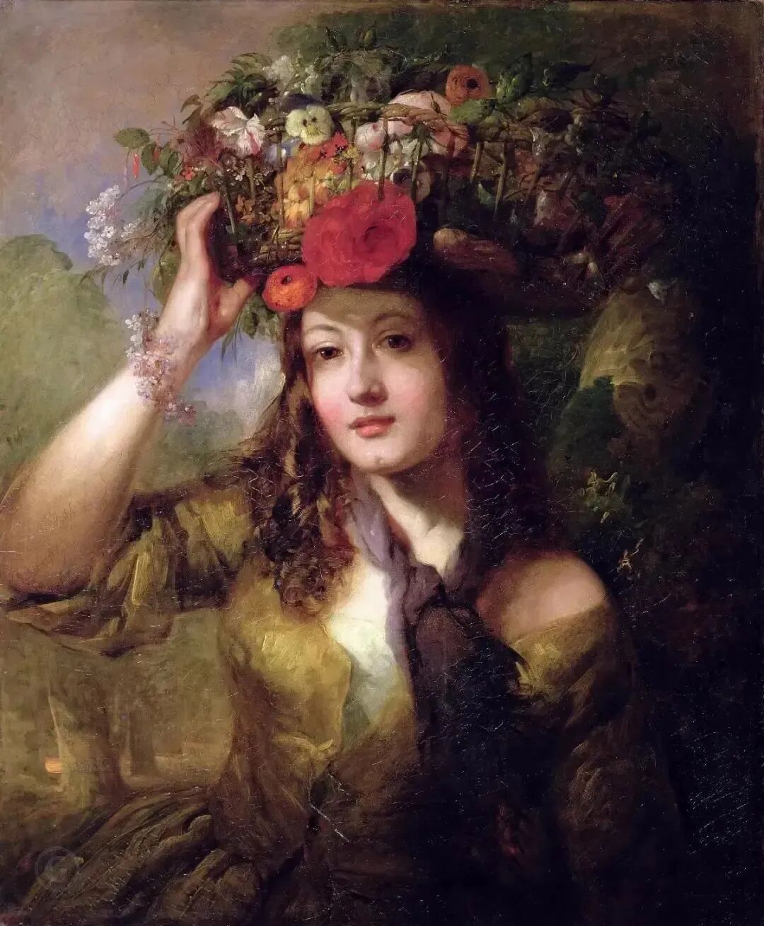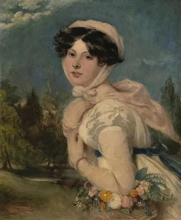 画家喜欢把人物和大自然的景物安放在一起,山野小径,这位戴着头巾的采花女从路旁飘然而过,裙裾飘扬,仙气飘飘,展现了农家女的朴实无华!