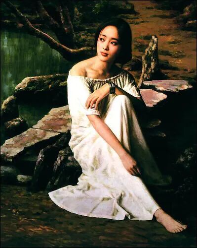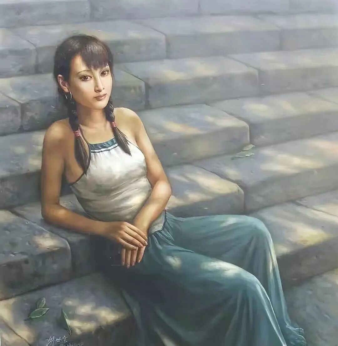 再来欣赏这幅画中的女孩,跟上面一幅完全不同,缕缕阳光洒下斑驳的树影,洒落在台阶上!画家创造了一种比较舒适休闲的氛围,让女孩席地坐在台阶上,代表着越往上走,人生之路就会越走越宽!