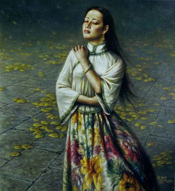 落叶满地,代表着秋天的到来,乐观的人把它作为落叶景观欣赏,而悲观的人则会产生秋风秋雨愁煞人的心境,上面这幅画中的女孩,看来是忧伤情绪!