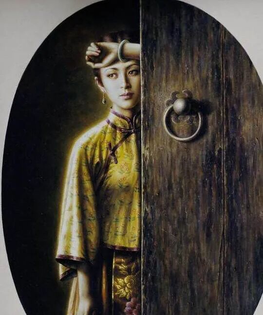 这扇古色古香的门非常厚重,那门上的古铜色拉环,说明此小媳妇的身份,大户人家的少奶奶吧!画家只让她露出了半个身体,一只手放在额头上,露出了手臂上的一只玉手镯。