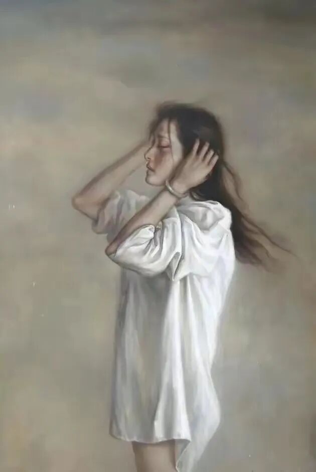 再来欣赏画家给女模特扎的发型,人生三千烦恼丝代表的是上面一幅画中的女孩,她的头发凌乱无序,说明女孩正处于无助的边缘徘徊,心思杂乱左奔右突!