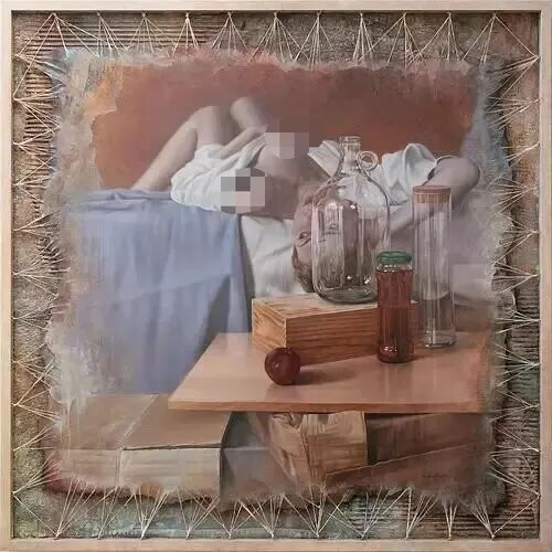 这幅画的视觉效果最为震撼,大家把画面倒过来看,画家通过这反向趴着的姿势,还有旁边桌子上的玻璃器皿、画框四周的荆棘等,折射了女孩此时内心最深切的痛苦和忧伤!