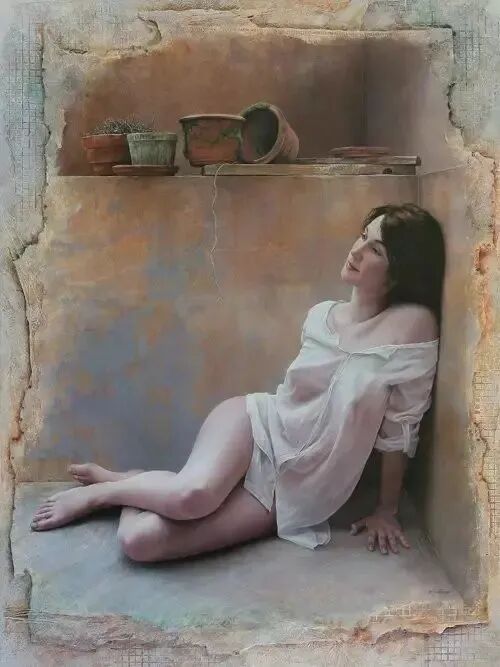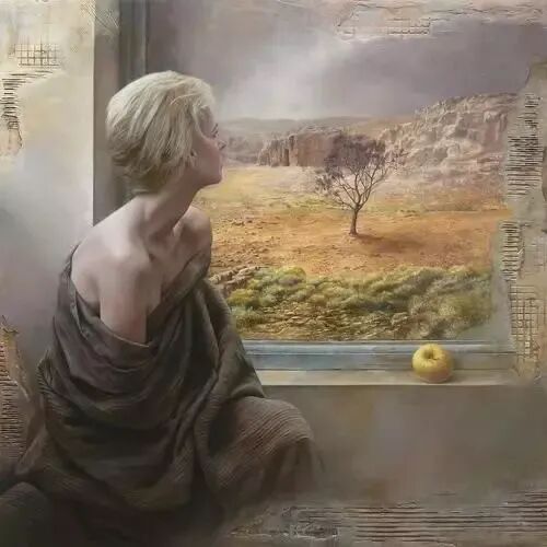 这是一位非常擅长于用背景来渲染画面气氛以及人物复杂情绪的画家!例如画面上枯萎的一片树叶、几只干瘪不再新鲜的水果、残垣断壁、破旧的瓦盆等,这些做旧物件,既能让观者产生一种复古情绪,又能一下子突出人物的视觉形象!
