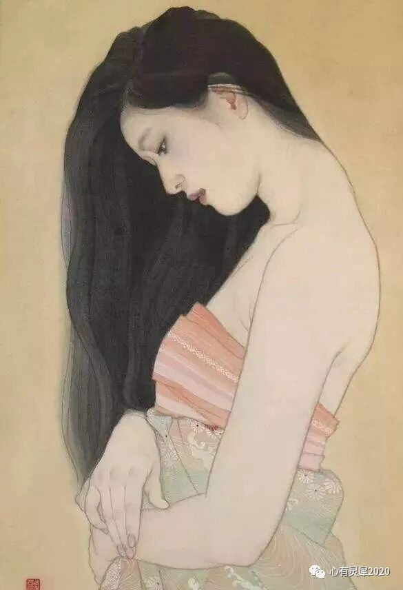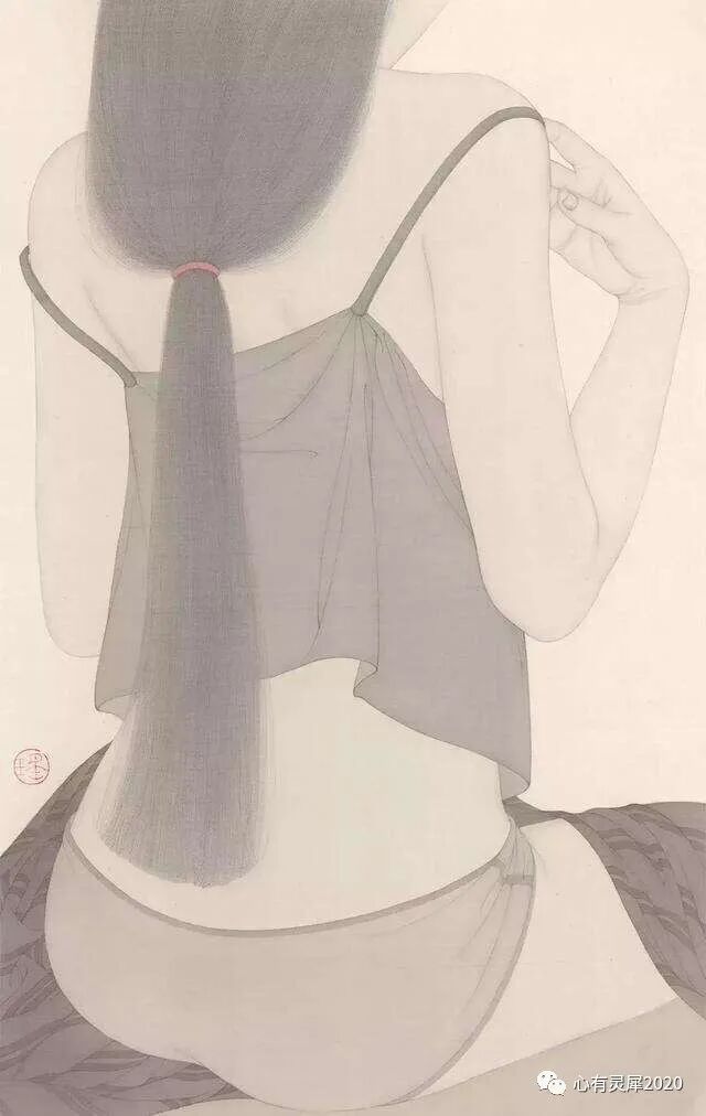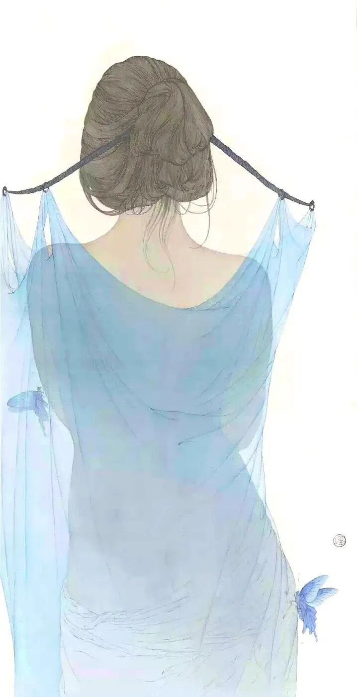 《瑶台镜》,真的是如梦初醒,九天瑶台的仙女下凡来了!这人体造型,清婉的背影,婀娜多姿的身姿,蓬松的发髻,悄然滑落的肚兜,闺中女子的婉约清丽淡雅跃然纸上,让人不自觉地产生怜爱之心!