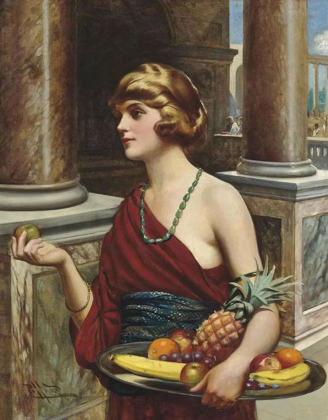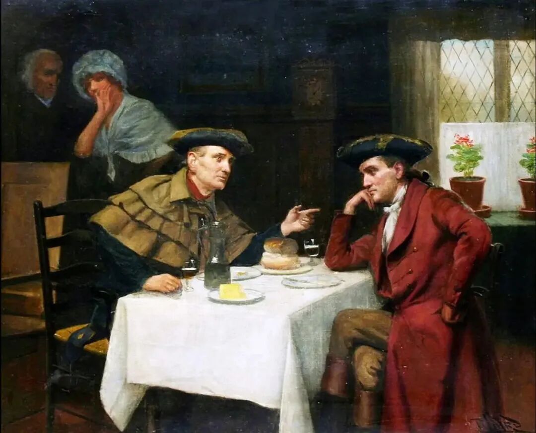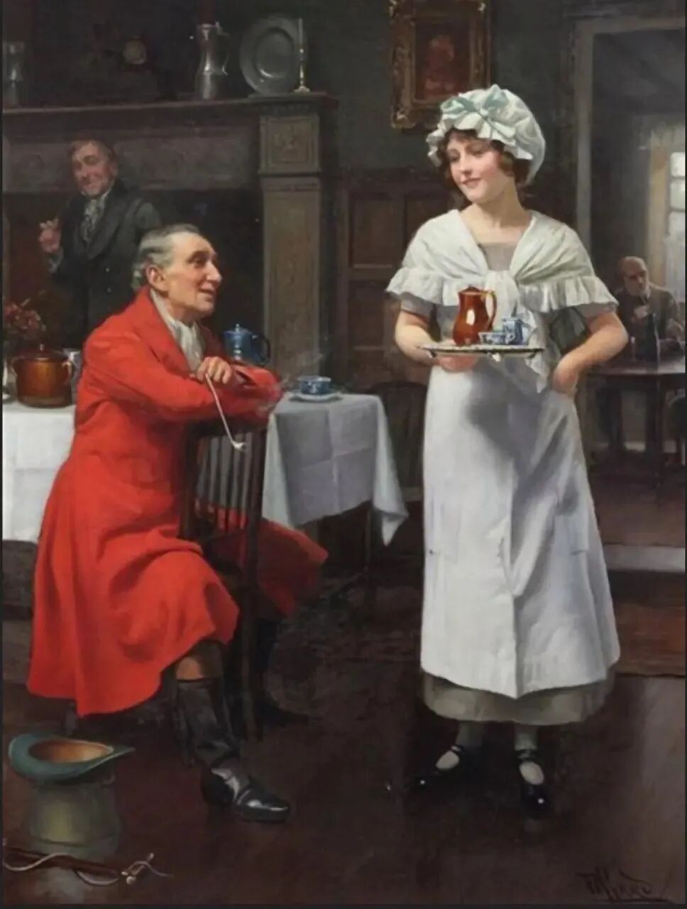 端着水果盘的侍女穿着白裙戴着有花边的白帽,看上去单纯又可爱,这位上流社会的红衣老男人对她非常感兴趣,忙着和她搭讪聊天!后面有一位男子,很羡慕地看着他们!