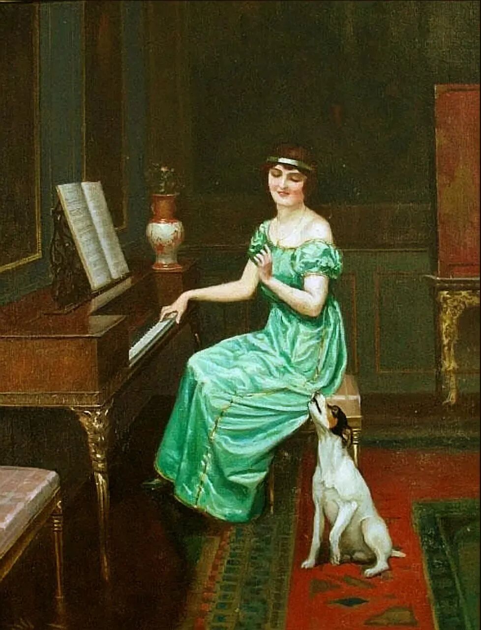 沉浸在弹琴中,忽略了爱犬🐶的存在,这下它生气了,咬住贵妇人的绿裙子,想让她带它出去玩,妇人一脸宠溺!