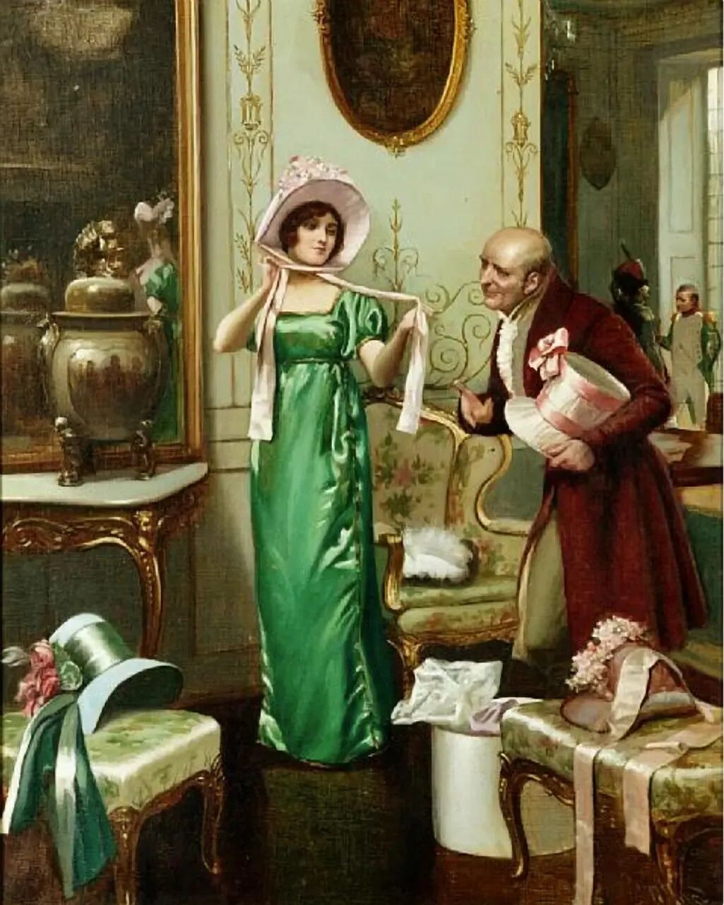 不知道两个人什么关系,女人正在选择戴哪顶帽子最漂亮,老头手里拿着一顶帽子,等待她挑选,而旁边的椅子上还有一顶帽子!室内的装饰设计比较豪华,那肯定不是父女,也不是妻子,估计是情人或者相好的,邀请她一起出席晚宴吧,毕竟身边的女人能艳压群芳,那男人也有面子!