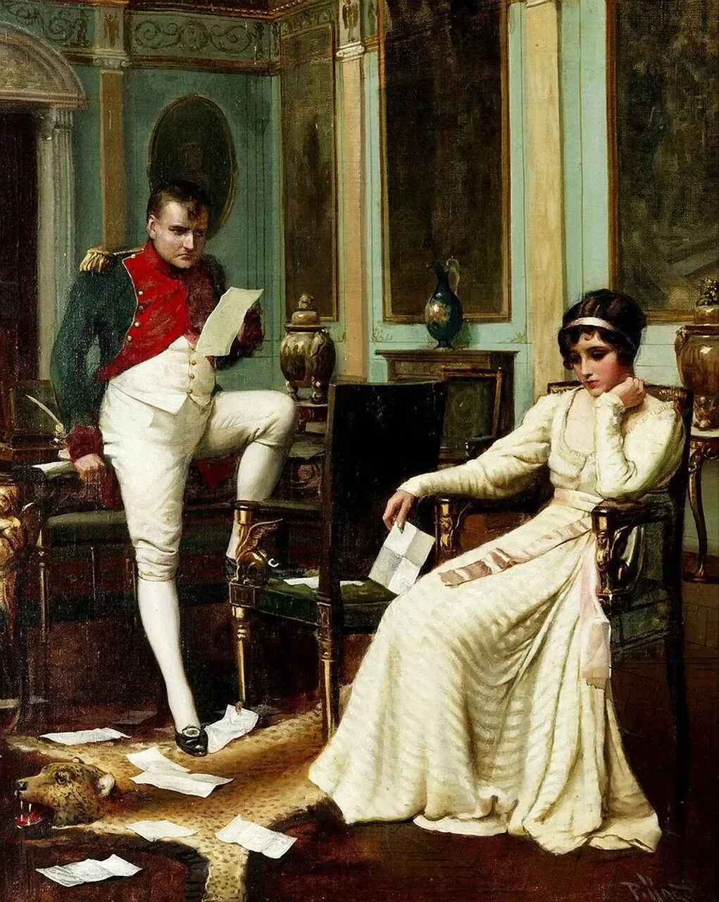 这书信肯定是带来了不好的消息,少妇看完就一脸悲伤,信纸洒落一地,旁边的是一名军官,也在看信,那联想到会不会是亲人在战争中遇难了呢!