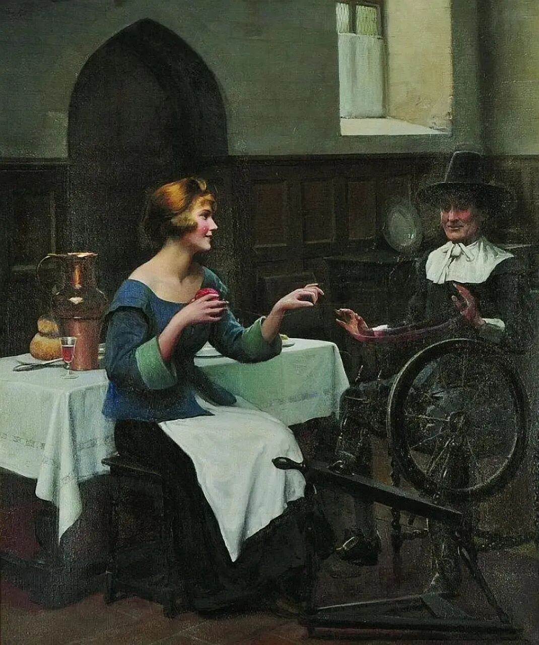 绕个绒线团也这么笑意盈盈,和对面板着脸的老妇人一比较,那就更显得优雅知性魅力四射了!有一种美,是需要烘托出来的!很多西方艺术家都采用过这种方式,就是找个丑陋的放在一起!