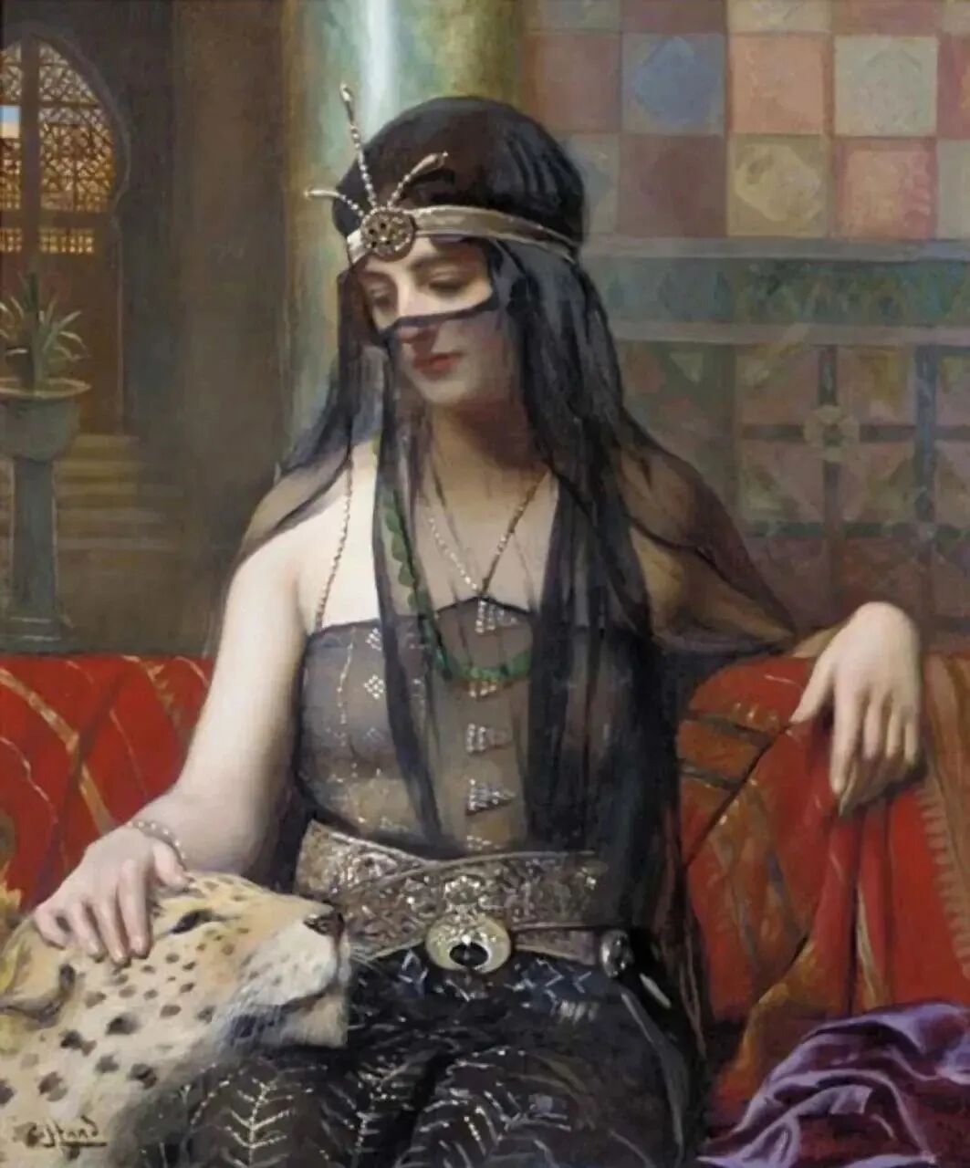 没看错,这是豹子,还是老虎,森林之王能和女人如此和谐共处,它在触摸女人这根象征地位的腰带,也说明了她的身份,或许是后宫的皇后娘娘或者哪位宠妃吧!