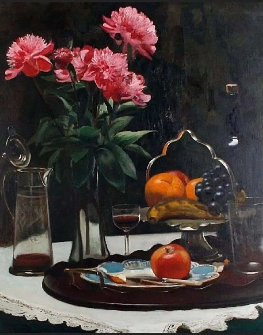 这静物的构图也相当巧妙精致,摆放的特别雅致漂亮,茶盆、玻璃杯、花朵🌺、水果,错落有致,有条不紊井然有序!再配上一位风姿绰约的女人,那就更让人百看不厌了!