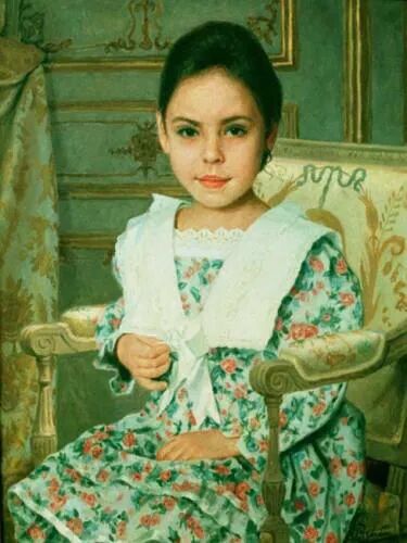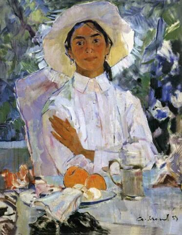 这是艺术家的妻子,据说戴着一顶中国帽,感觉像山里乡村女子戴的斗笠帽!情人眼里出西施,在画家笔下的妻子比较优雅知性,显得柔美而又灵气十足!