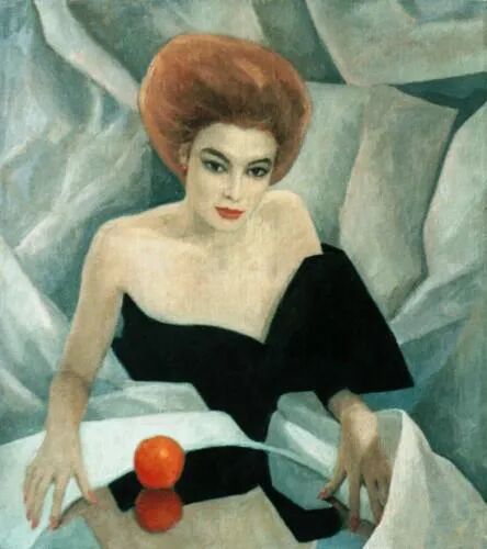 这幅画中的黑衣女性形象则显得比较妖娆性感,背景的白色氛围和桌上的红色水果,都是为了烘托她的存在感,让观者一眼就注意到她白皙细腻的肌肤和精致的面容,还有她若有所思的神情!