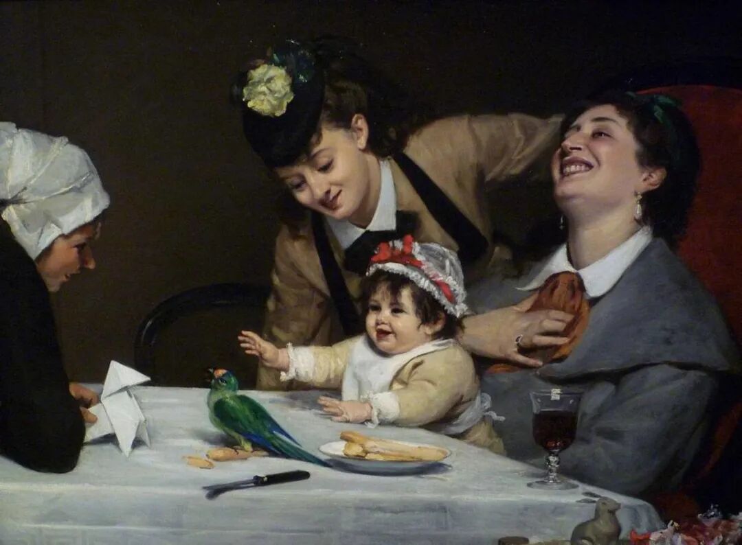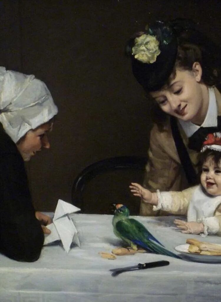 这幅画的主角是一二岁的孩子和那只红嘴绿鹦哥,而爸爸妈妈和奶奶都是配角,她们在一起玩一场游戏!那折的是什么,大家知道吗,感觉小时候也玩过这个游戏!