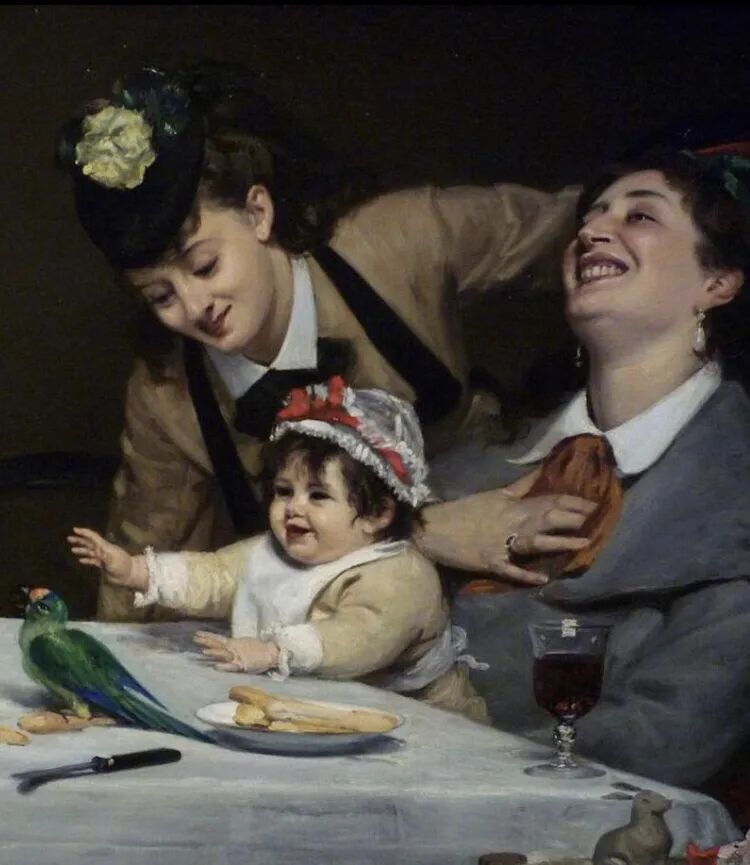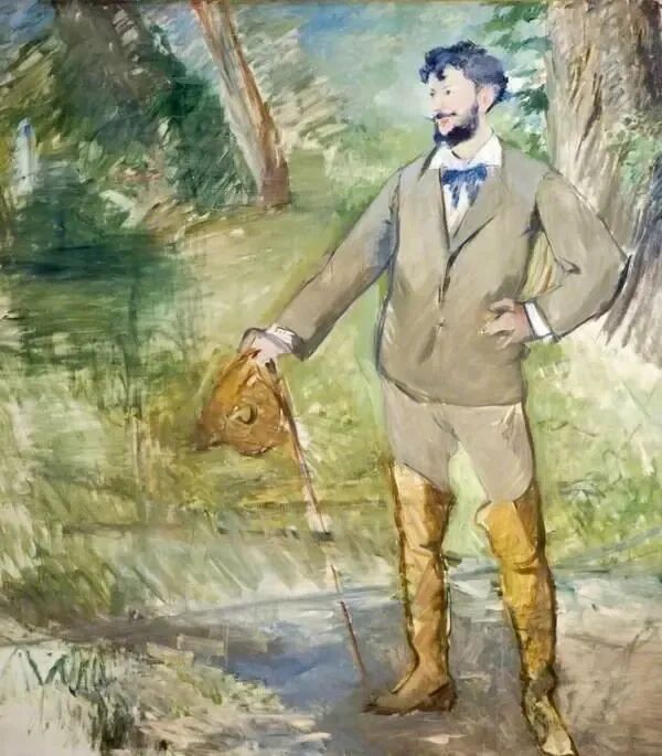 而这幅是马奈即兴创作的·卡罗勒斯-杜兰的肖像画,画面上的画家上身穿着西装,下边穿着短裤,很随意地站在那里,一手叉着腰,一手拿着文明棍,感觉是拿着鱼叉站在河边,估计想浑水摸鱼!其神情憨态可掬,八字胡微微上扬,非常具有戏剧性!