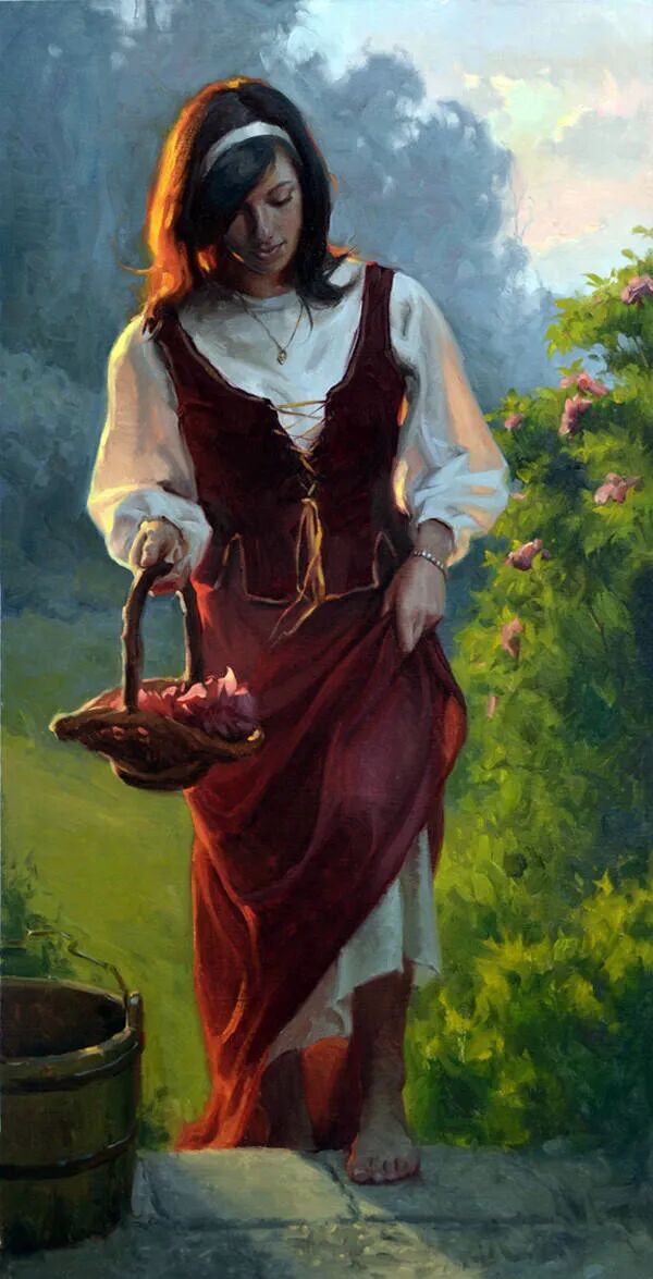 草木葱茏,花儿争相绽放,一名乡村姑娘河边提了一大桶水,回头又采摘了一篮子野花,一缕朝阳辉映着她的清纯脱俗和朴实无华!