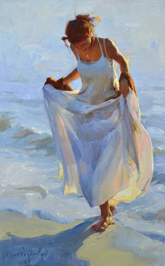 赤足走在沙滩上,踏浪而行,就像一只飞翔的海鸥,在水面轻轻略过!画家展现了女孩轻盈的脚步,飘逸的长裙,和她的活泼开朗、青春活力,也给观者带来了轻松愉快的心情!
