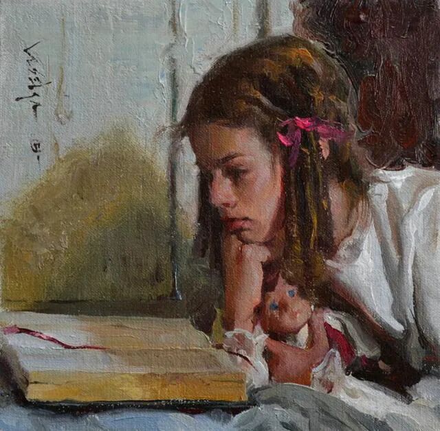 这幅画中的小姑娘看书看得比较认真,似乎是被书中的某段情节吸引了!