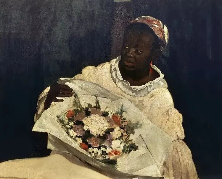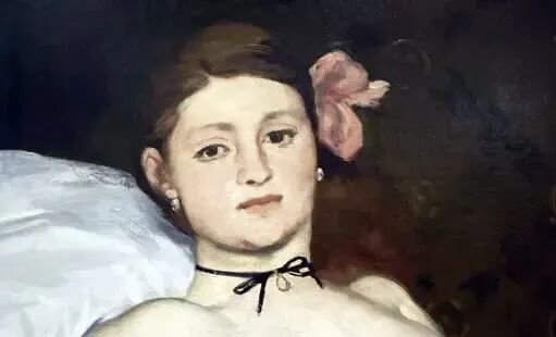马奈创作的《奥林匹亚》,这两幅画是连在一起的,在这里展示的是局部图,特意让大家欣赏一下这位捧着花束的黑女佣!当然她是没资格享受鲜花的,它是外面客人献给下面这幅中女主人的!头发上插了一朵粉色的花朵,代表着她的身份,也许是一名欢场女子,暂时靠在床榻上休息!
