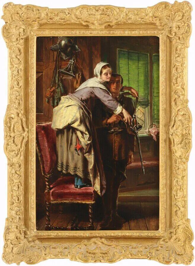 这幅画取名《女仆把剑拔》,这女仆是在凳子上替男主人拔剑的,两个人挨的这么近,似乎能听到彼此的心跳声!而男人显然有些把持不住,眼睛很不老实地偷看!