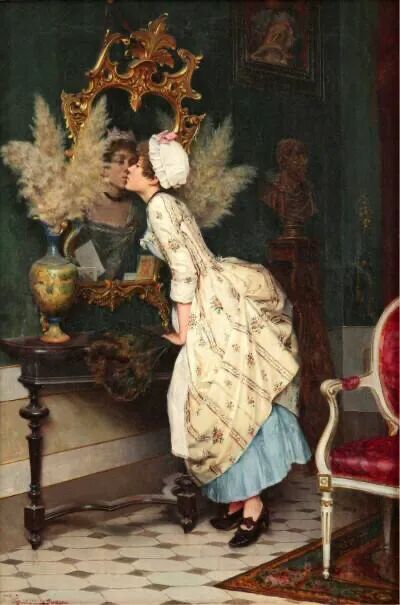 女仆在照镜子,而且对着玻璃在吹气,是为了擦玻璃,还是在取悦自己!小编觉得这幅画还有另一层含义,那就是女仆是个孤女,没人怜爱,这动作也是表达自己爱自己的一种方式!