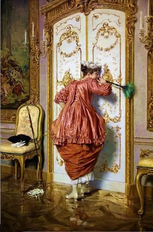 《好奇》,这位女仆一边在主人家客厅里搞卫生,却因为好奇心,而趴在门口听壁脚,她的背影和服饰实在很搞笑,当然也很可爱,画家也许就是把她当作小丑形象,供观者取乐的!