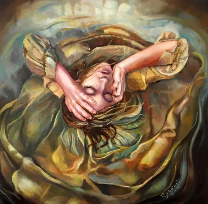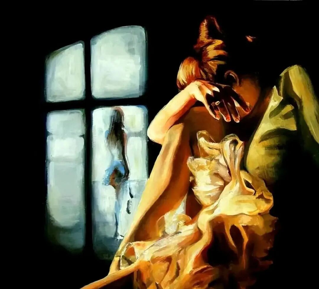 画家刻画了女子靠在沙发上空洞的眼神,也许已经是喝醉了,也许是半醉半醒,也许是一边喝酒,一边勾起了伤心事,然后借酒消愁,只是越喝越难过,伤痕累累的心是无法用酒精去缝合伤口的,只能是依靠自愈能力!