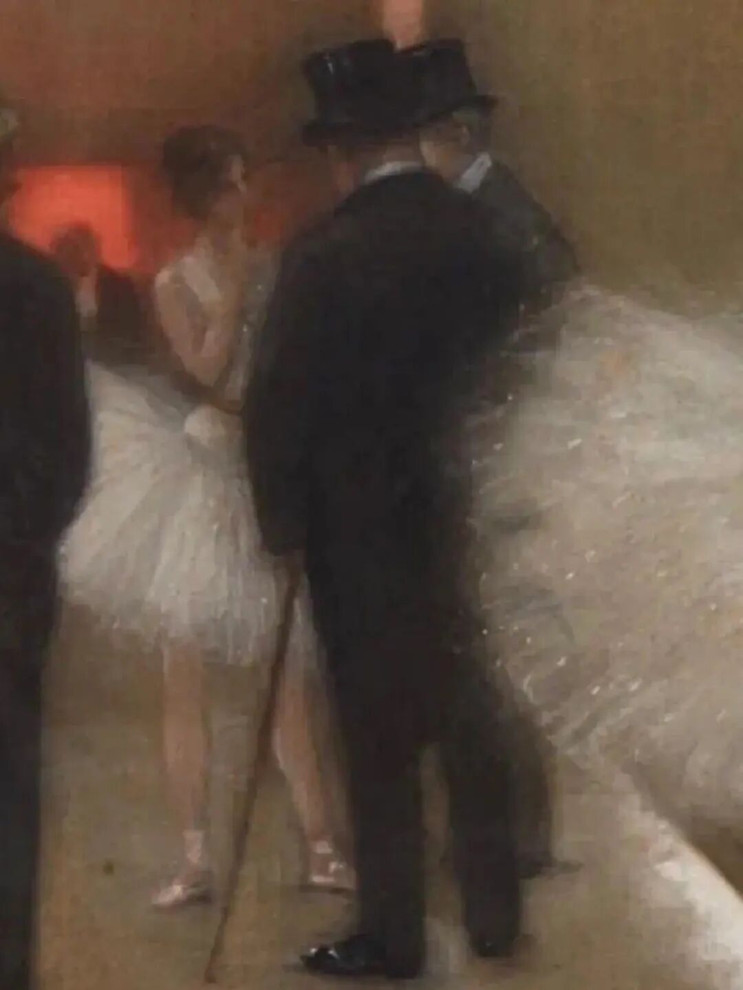 而另一边有两位男人在跟这位芭蕾舞女孩谈什么呢,是某种交易吗,或者是经纪人,你上场我们捧场,但赚钱了必须互惠互利,这样才能合作愉快!但究竟是一半分,还是三六、三七或者四六开,这个问题值得探讨!