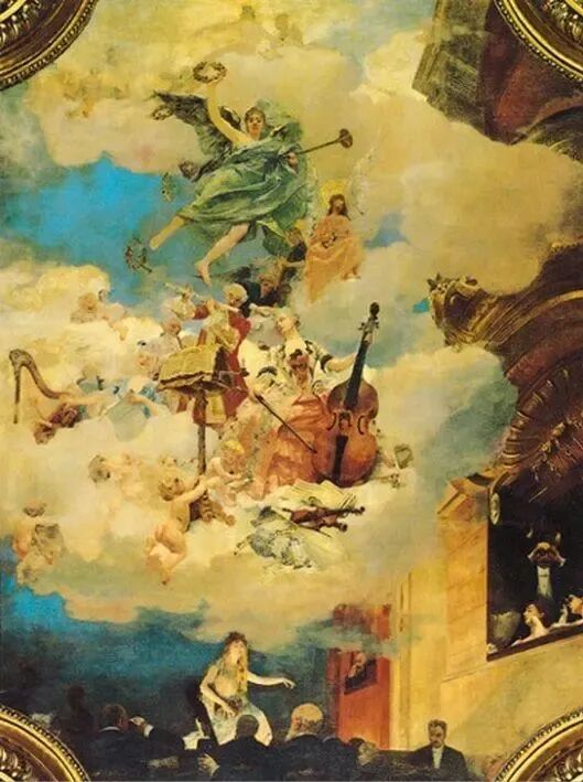 这幅画气势恢弘,画家把人间歌舞升平的音乐会与太空的音乐会同时出现在一幅画中,这样的组合,体现了他现实主义和浪漫主义互相融合的创作风格,也表达了音乐的力量,已经超越了时空的限制!