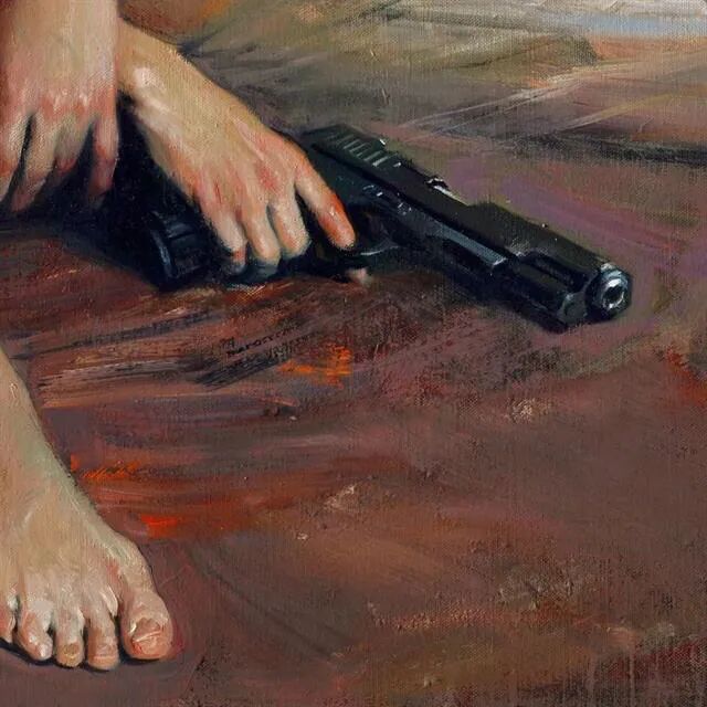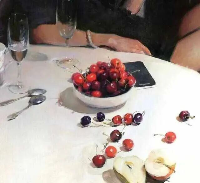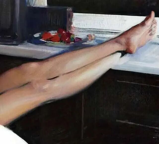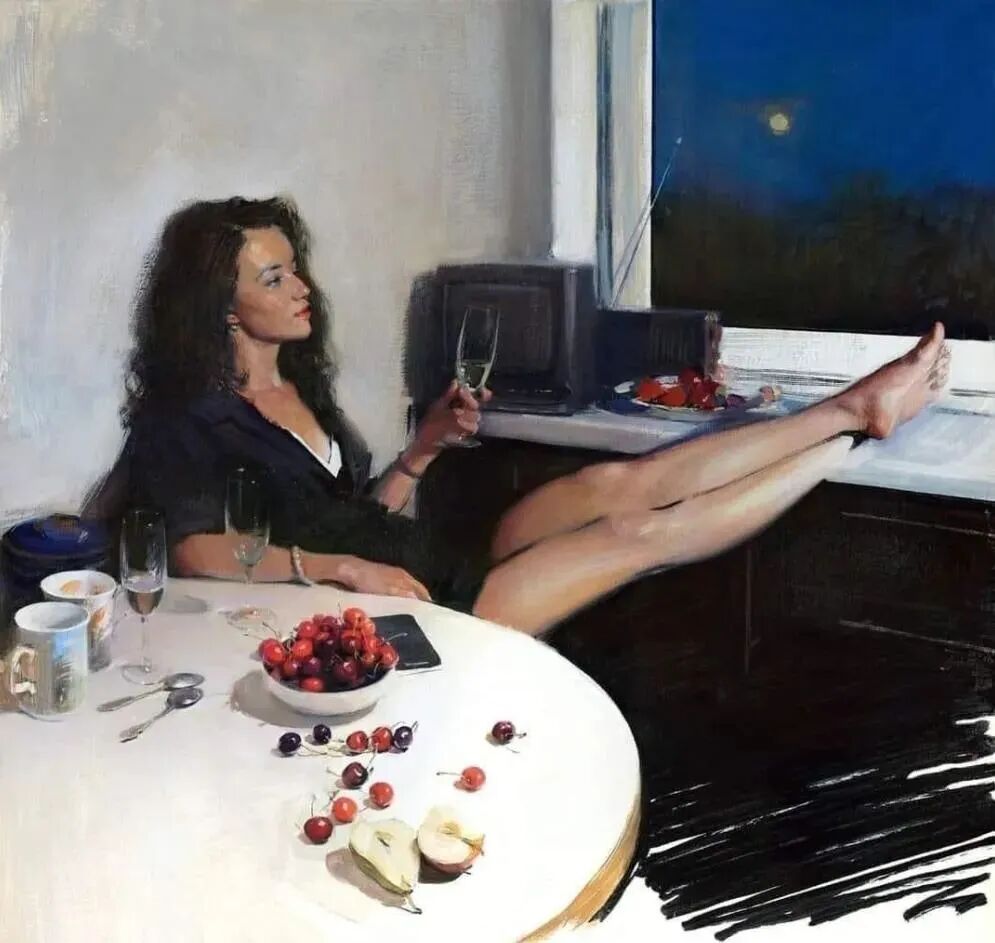 这是一位非常注重细节描写的画家,场景是一位女性,把腿翘在窗台上,在对着窗外的月亮干杯🍻!从桌上的两只酒杯🍺,以及切开一半的水果,感觉应该不是一个人在喝酒!但画家却并没有把另一个人放在画布上,这样的构图,情不自禁引发观者联想,对方到底是男是女,是闺蜜还是情人!