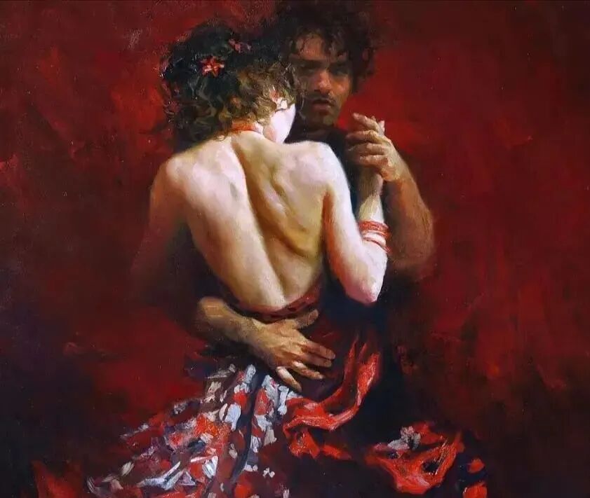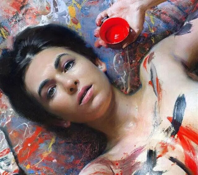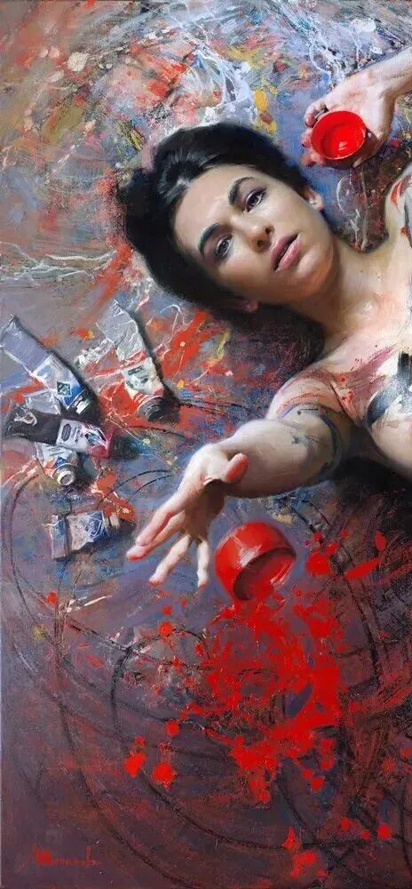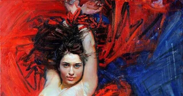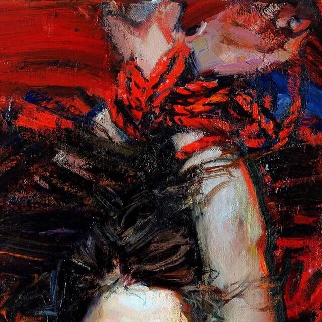 画家很喜欢在画中运用红色元素,红色代表热烈,代表节日气氛,但有时候红色也代表一种革命的反抗精神!如上面那幅被绳子绑住的女性!虽然被束缚了手脚,但无法锁住她追求自由的灵魂!