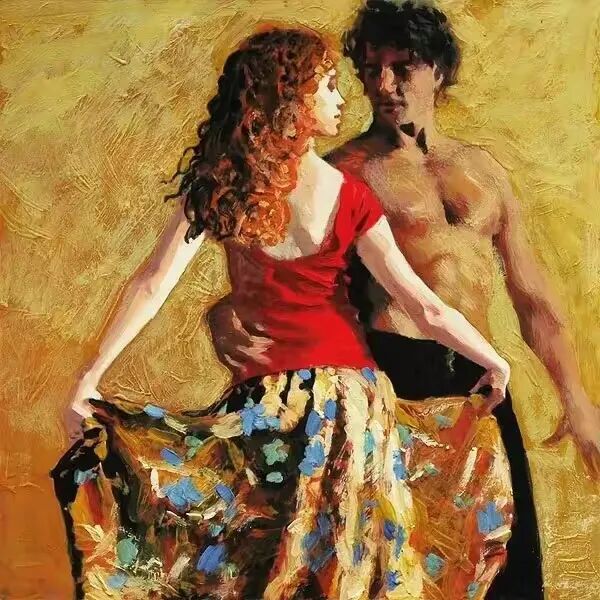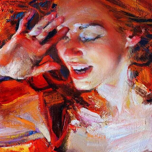 如果上一幅的重点在于细节,那这一幅完全相反,画家运用的是大笔触和鲜艳的色彩!当时画家在创作时,一定是激情满满,大笔一挥,就把这位女孩的青春活力展现在我们眼前!她灿烂的笑容,飞扬的红发,旋转的红裙,给观者留下了深刻的印象!