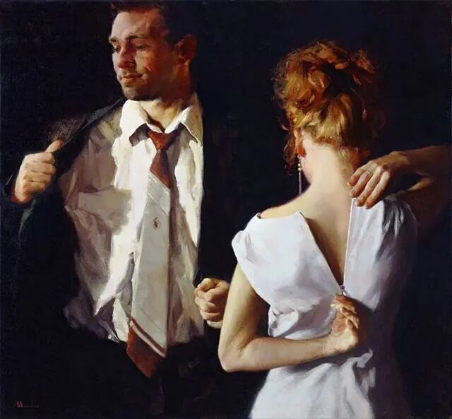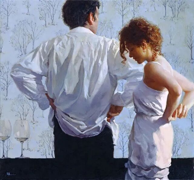 对于爱情,男女之间的关系,画家展现的场景也很微妙,男女穿衣时的细节,可谓是心照不宣!