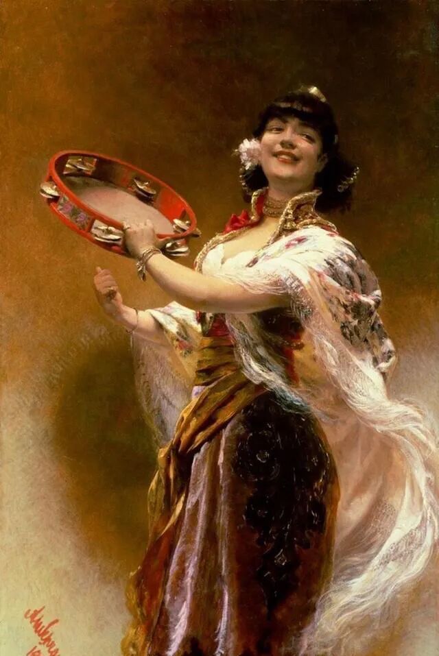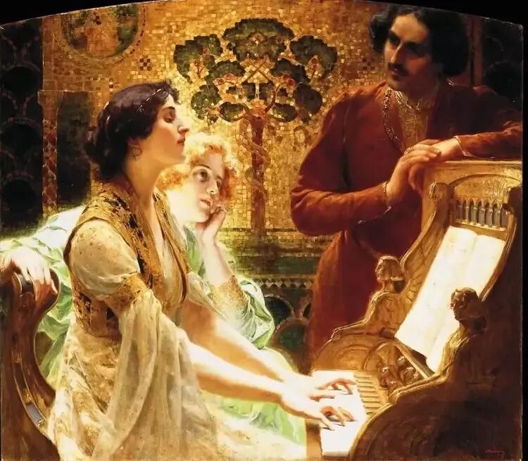 这幅画的场景非常引人入胜,颇有影视剧的镜头感!小编仿佛听到了悠扬婉转的旋律,在画布上来回游荡,坐在旁边的那位闺蜜也在静静地聆听,可这位男士呢,与她形成了鲜明的对比,他不是在听音乐,而是在欣赏弹琴的女孩,你看他的眼神。如此专注!