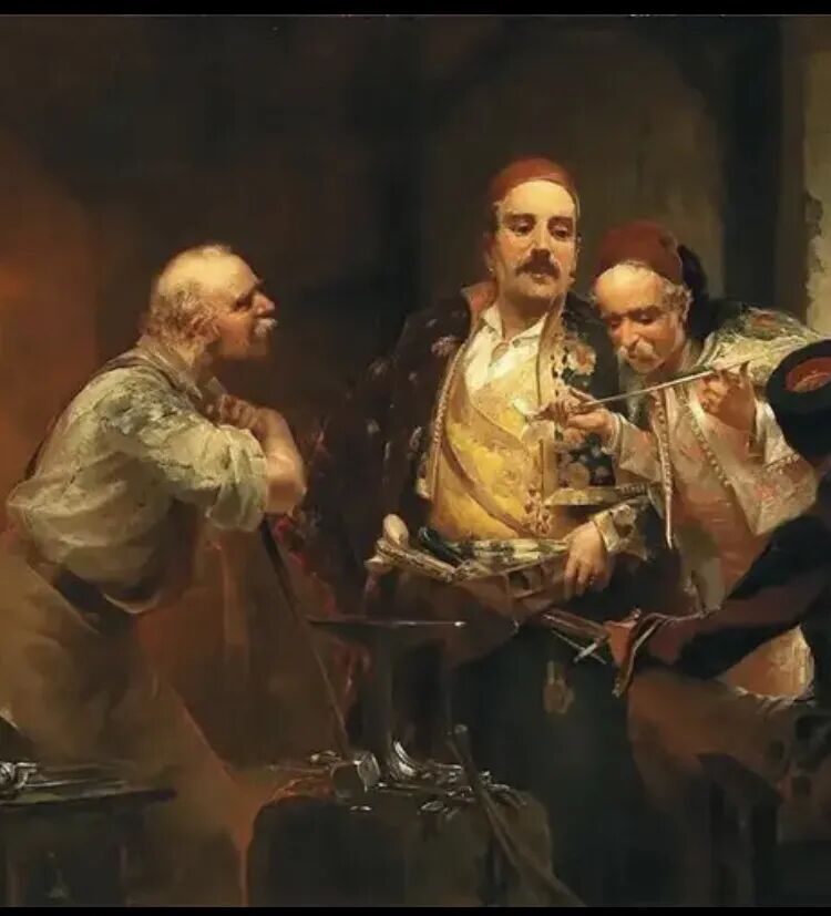 这幅画应该是某种利益的交易场景,带有象征主义倾向!那杆代表公平正义的秤说明了一切,老者左右各有一个人,一边凶神恶煞站着,眼睛紧盯着秤杆,而另一边是坐着的士兵,把剑🗡️压在那秤砣下面!