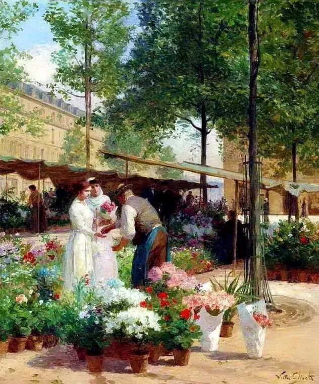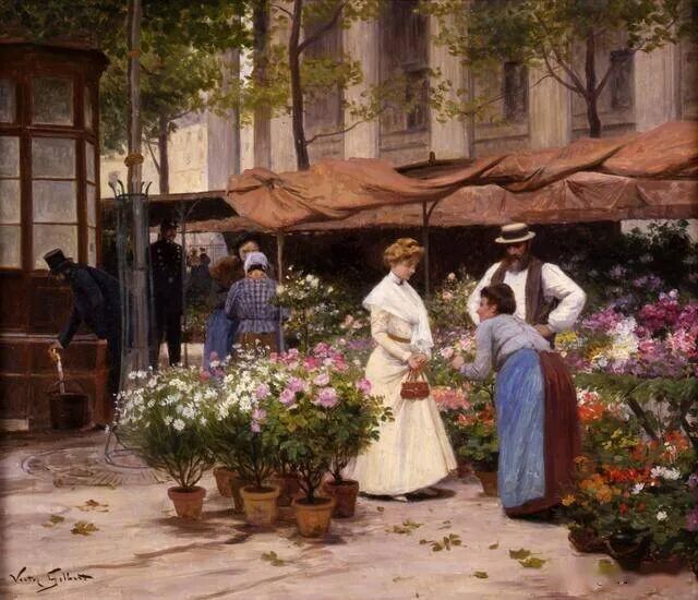 维克多·加布里埃尔·吉尔伯特还画了很多街头巷尾的卖花买花者,能够有闲情逸致侍弄花草的,多半是有闲有钱!每天欣赏花花,然后男男女女一起约会,生活悠哉悠哉!